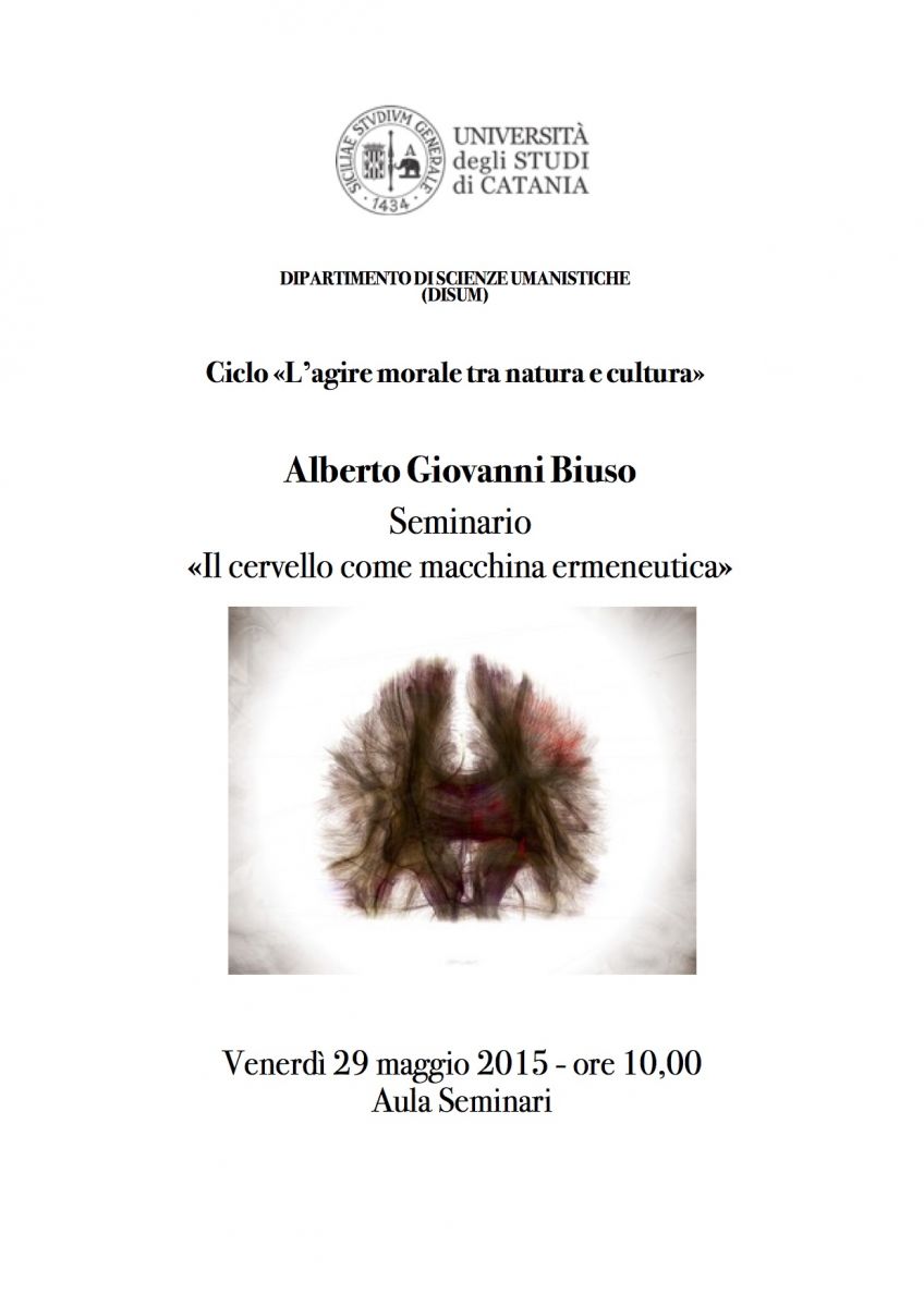Venerdì 29 maggio 2015 alle 10,00 nell’Aula Seminari del Dipartimento di Scienze Umanistiche di Catania terrò una lezione dal titolo Il cervello come macchina ermeneutica.